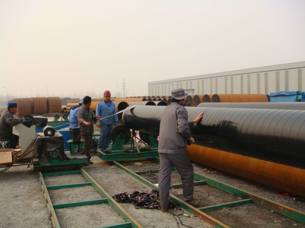 (1) 除銹、除焊縫、毛刺,油、污物并干燥。手工并除銹應(yīng)達St3級,機械除銹應(yīng)符合SYJ 4 0 0 7—8 6中的Sa2級。 (2) 底漆(手動或機械) (3) 底漆表干時即可纏帶,纏帶應(yīng)符合防腐層等級及結(jié)構(gòu)要求。 (4) 用電火花檢查合格即可下溝填上。